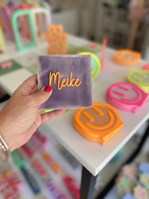 Wie wil dat nu niet? Een tegeltje met je naam of favorite woord! Jij kiest de kleur van je tegel en daarna de kleur waarin jou woord of naam geprint word, easy!