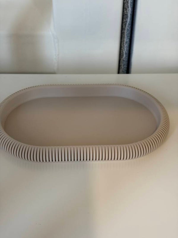 Deze ovale tray is de perfecte basis voor een stijlvol interieur. Het moderne ontwerp met verfijnde ribstructuur aan de rand geeft een subtiele, luxe uitstraling zonder te overheersen.